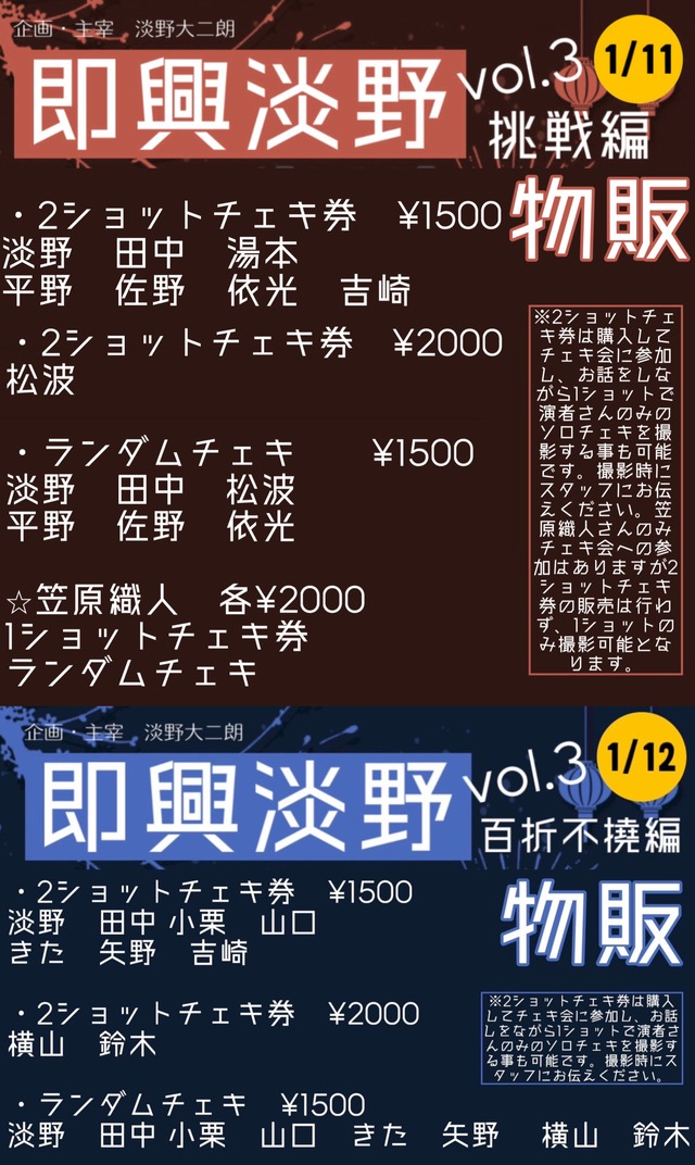 こちらは特典チケットの販売ページです。 ※吉崎弾さんは通常チケットのみの販売となり、特典付きチケットの販売はございません。 ----------------------- 即興淡野 Vol.3 day1 :挑戦編 淡野大二朗/湯本貴大/松波優輝/笠原織人 田中宏輝/平野隆士/佐野遥喜/依光希空 吉崎弾(ピアノ生演奏) day2 :百折不撓編 淡野大二朗/田中宏輝/小栗諒/山口翼 きたつとむ/矢野冬馬/横山統威/鈴木恋 吉崎弾(ピアノ生演奏) 【日程】2026年1月11日、12日 1部♦︎11:00op/11:30st/13:30cl 2部♦︎14:30op/15:00st/17:00cl 3部♦︎18:00op/18:30st/20:30cl 【会場】中野Studio twl 東京都中野区新井3-16-7 B1F 【チケット料金】全席自由 通常席4000円 特典席6000円 ※特典は年賀状風ポストカードを予定